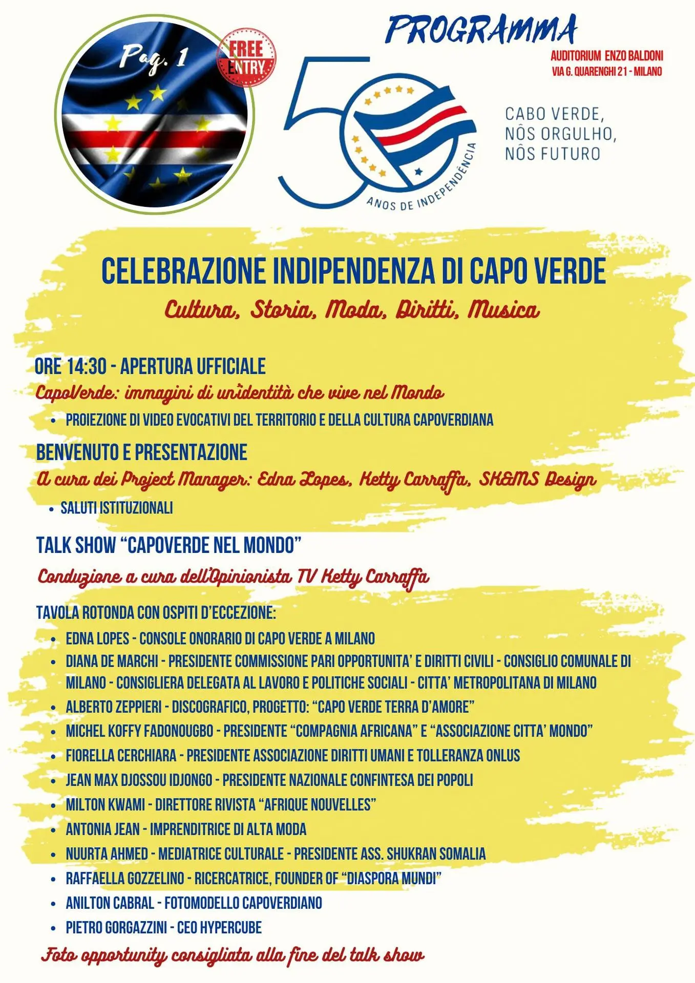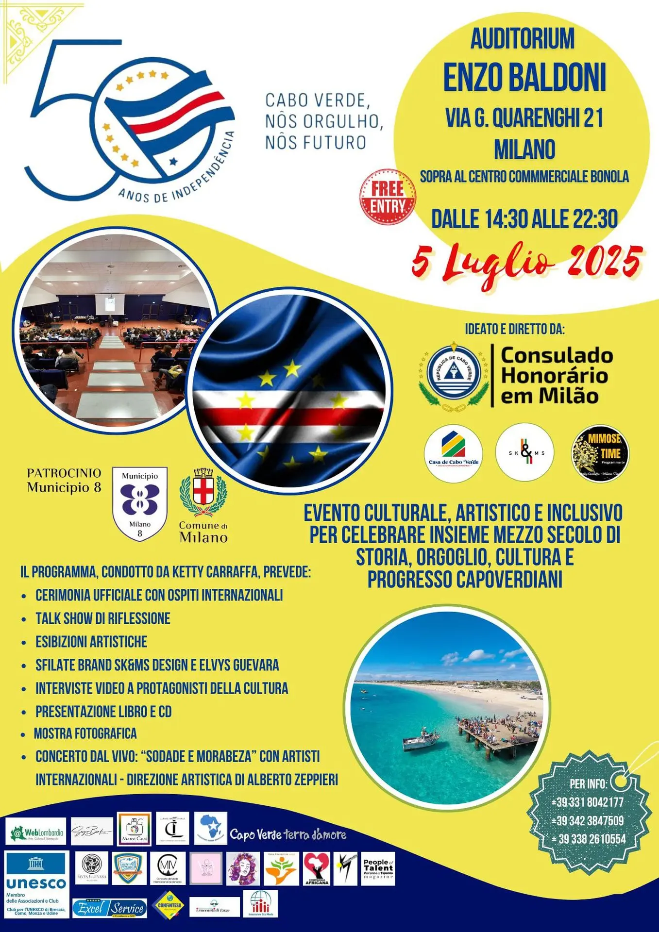 In occasione del 50° Anniversario dell’Indipendenza di Capo Verde, il Consolato Onorario a Milano, in partnership con APS Casa de Cabo Verde, SK&MS Design e Mimose Time Programma TV di KC, organizza un evento di grande rilevanza simbolica e sociale che intende unire Capo Verde e la sua Diaspora in un abbraccio universale.